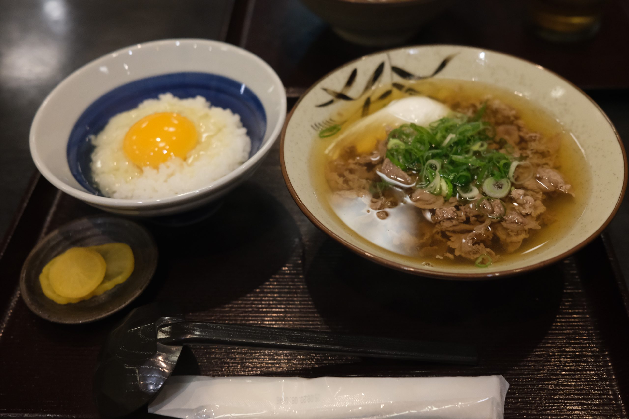 関西風のだし汁にお肉とネギ、卵が入っていました。朝からバタバタと移動していたので、疲れていた体に染みわたりました…