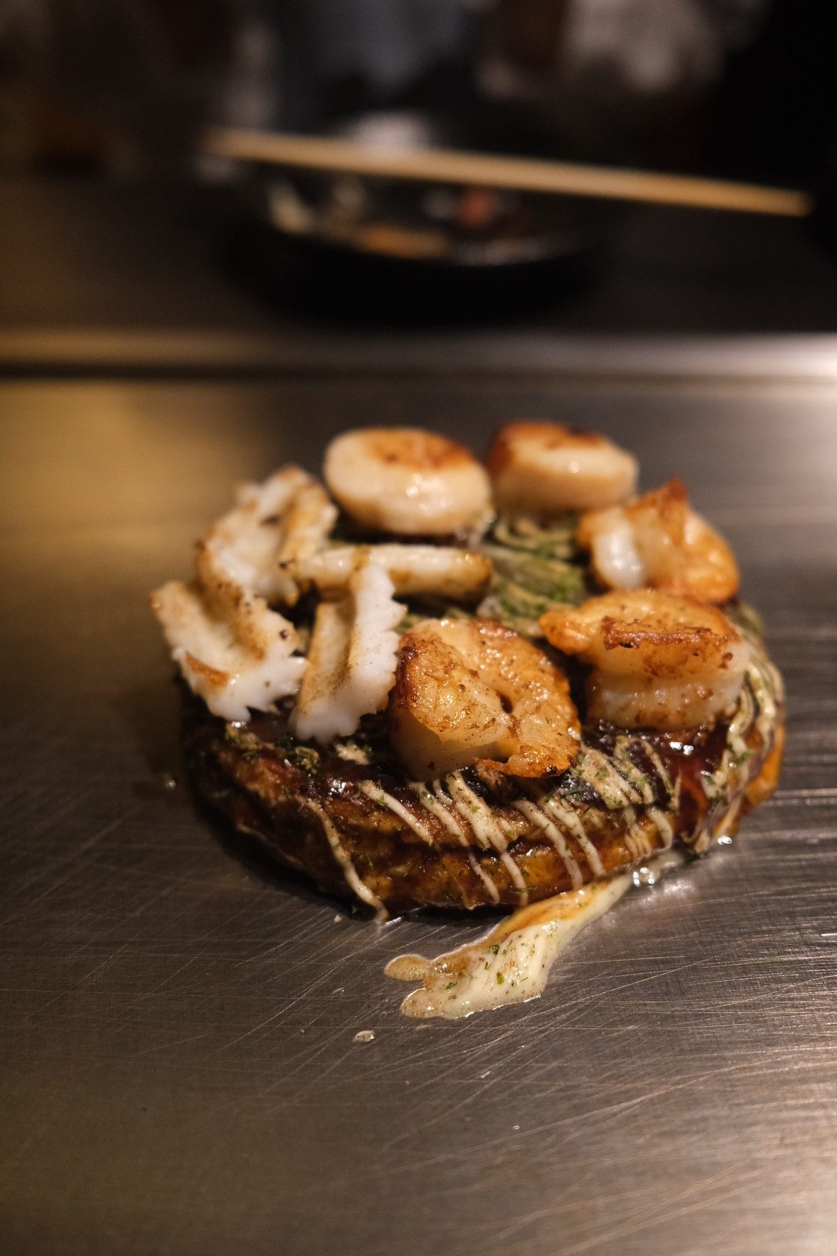 夜はお好み焼きを食べました。エビやホタテがたくさん載っていて、本場の味が食べられて嬉しかったです。