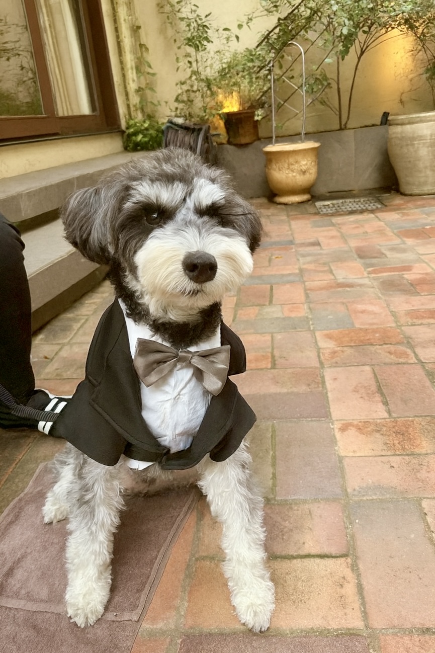 夫の父がデザイナーということもあって、この日のために政界に一つだけのタキシードを手作りしてくれました。 レンタル衣装の私たちより、愛犬のほうが贅沢でした(笑)